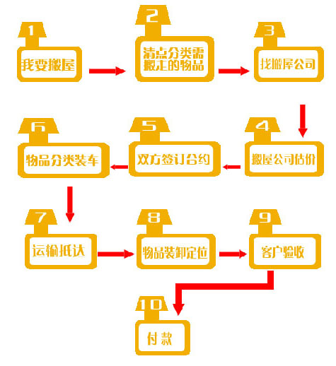 按客户家俱物品分类,顺序上车;抵达新居后,再按客户指定位置,定位码放。